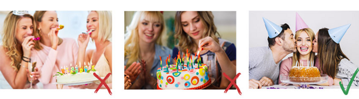 Evitare l’uso di immagini con aree di un solo colore molto ampie come cielo, mare...ecc. Naturalmente, se si tratta di parte di un'immagine che appartiene a una splendida baia, o di un meraviglioso cielo blu con piccole nuvole bianche, è perfetto. Comunque, a volte riceviamo immagini di una coppia che nuota nel mare con lo stesso colore del cielo che li sovrasta, nelle quali il 90% dello spazio è di colore simile. Cercate di immaginare di assemblare un jigsaw puzzle di 1000 pezzi in cui 900 pezzi sono blu, azzurro o blu scuro.